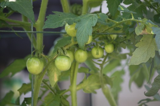 Jason has these self-watering containers in the backyard where he plants tomato seedlings. The second planting season in Houston is mid-September so he cut down the old Cherokee Purple and the Sugar Lump plants that were dying away, but he saved the very tops of them that were new growth, growing out of the old. And he replanted them in the containers. Just to see what would happen.